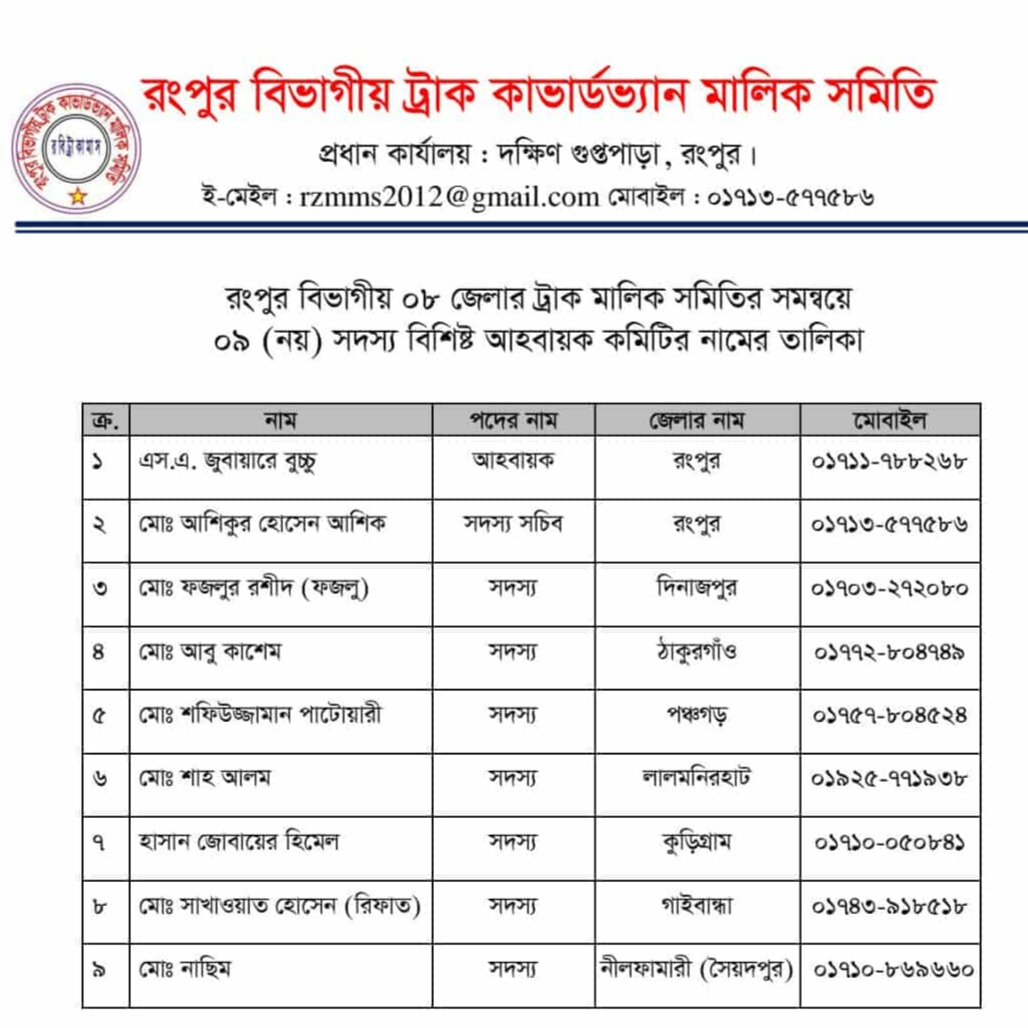 রংপুর বিভাগীয় ট্রাক কাভার্ডভ্যান মালিক সমিতির সমন্বয়ে ০৯ (নয়) সদস্য বিশিষ্ট আহবায়ক কমিটির নামের তালিকা প্রকাশ করেছে সংগঠনটি। রোববার (১০ আগস্ট) দুপুরের দিকে রংপুর বিভাগীয় ট্রাক কাভার্ডভ্যান মালিক সমিতি প্রধান কার্যালয় দক্ষিণ গুপ্তপাড়া অফিস থেকে এ নামের তালিকা প্রকাশ করেন।