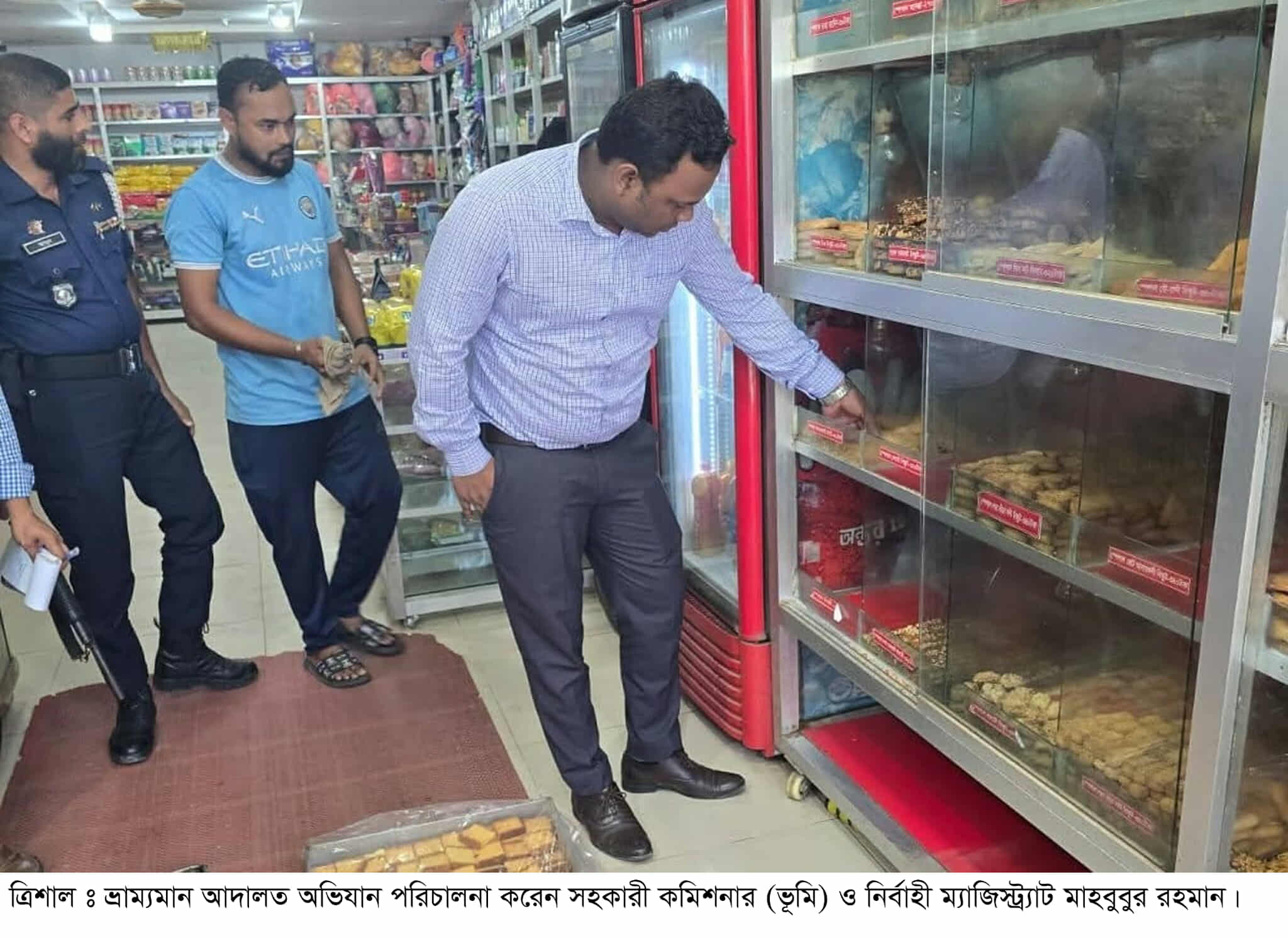 ময়মনসিংহের ত্রিশাল উপজেলার পৌর বাজার ও বাসস্ট্যান্ড এলাকায় সোমবার (১ সেপ্টেম্বর) ভ্রাম্যমান আদালত অভিযান পরিচালনা করেছে। এর নেতৃত্ব দেন সহকারী কমিশনার (ভূমি) ও নির্বাহী ম্যাজিস্ট্র্যাট মাহবুবুর রহমান। অভিযানে আবারও ‘রসের মিষ্টি’ নামক দোকান ও বাসস্ট্যান্ডের একটি হোটেলকেও একই ধরনের অপরাধে অভিযুক্ত হওয়ায় জরিমানা আদায় করা হয়।
