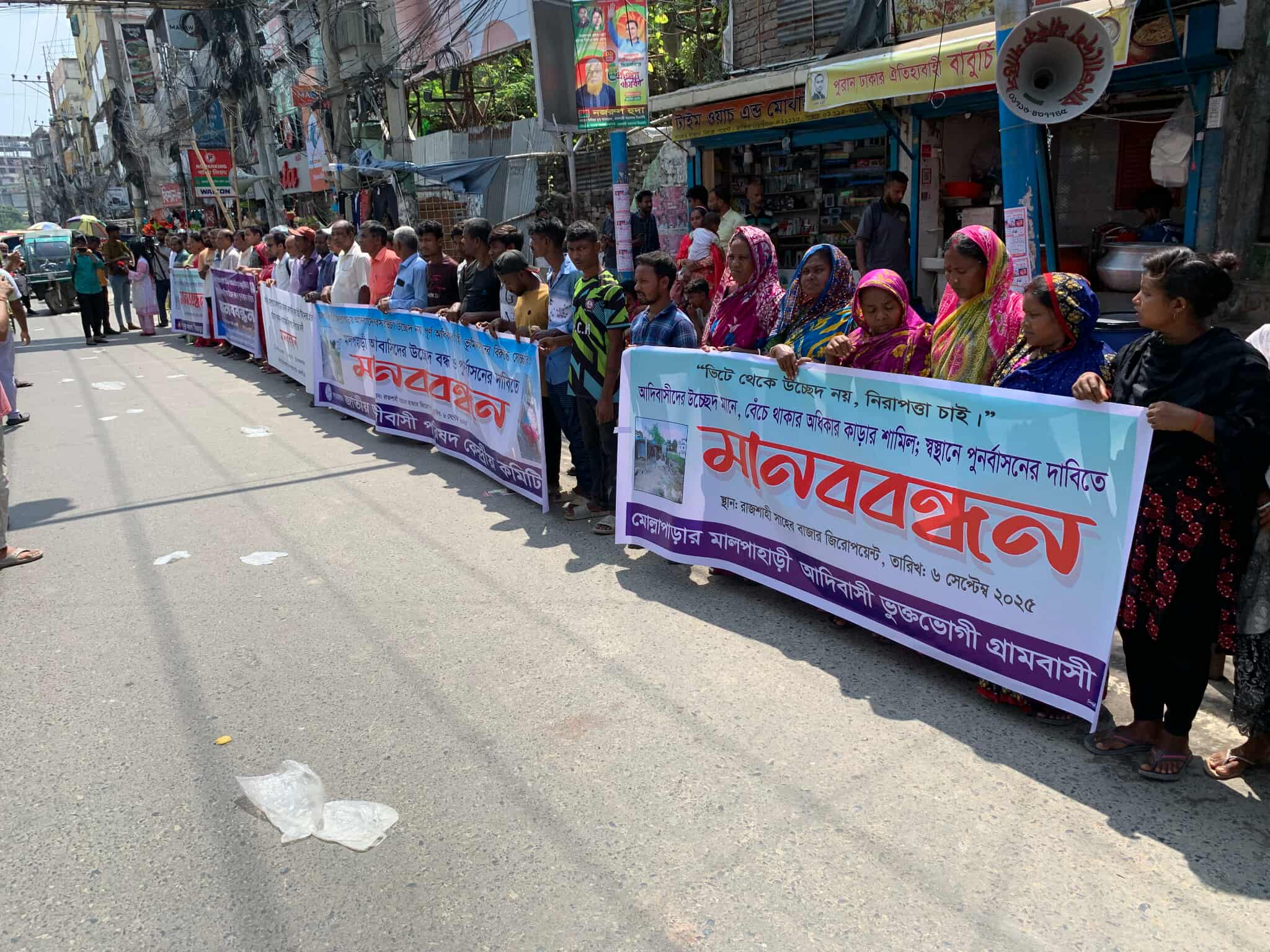 রাজশাহীর মোল্লাপাড়ার মালপাহাড়িয়া আদিবাসী জনগোষ্ঠীর বসতভিটা উচ্ছেদের প্রতিবাদ, স্থায়ীভাবে পুনর্বাসন ও সামাজিক নিরাপত্তা নিশ্চিতের দাবি এবার সামাজিক আন্দোলনে রুপ নিয়েছে। শনিবার বেলা ১১ টার দিকে সাহেববাজার জিরো পয়েন্টে সামাজিক আন্দোলনের অংশ হিসেবে মানববন্ধন করেছে বিভিন্ন সামাজিক সংগঠন। জাতীয় আদিবাসী পরিষদ কেন্দ্রীয় কমিটি, বরেন্দ্র ইউথ ফোরাম রাজশাহী, সবুজ সংহতি রাজশাহী মহানগর, দিনের আলো হিজরা সংঘসহ বিভিন্ন সংগঠন এবং রাজশাহী মহানগর ও কাশিয়াডাঙ্গা এলাকার মোল্লাপাড়া মালপাহাড়ি আদিবাসী ভুক্তভোগী গ্রামবাসীর যৌথ উদ্যোগে এ মানববন্ধন অনুষ্ঠিত হয়। এ আন্দোলনে রাজশাহী জেলা ও মহানগর সিপিবি, উদীচী ও খেলাঘর সংহতি জানিয়েছে।