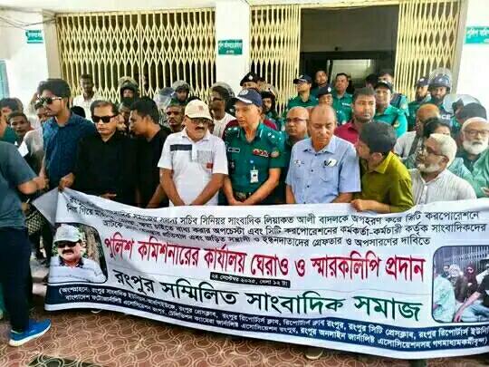 রংপুরের সিনিয়র সাংবাদিক লিয়াকত আলী বাদলকে অপহরণ করে সিটি কর্পোরেশনে নির্যাতন এবং প্রধান নির্বাহী কর্মকর্তার কাছে ক্ষমা চাইতে বাধ্য করার চেষ্টা এবং মব তৈরি করে সাংবাদিকদের মারধর এবং হেনস্থার মামলার আসামীদের গ্রেফতারের দাবিতে মহানগর পুলিশ কমিশনার কার্যালয় ঘেরাও কর্মসূচি পালন করে গণমাধ্যমকর্মীরা। সেখান থেকে অপহরণ ও হামলাকারীদের তিনদিনের মধ্যে গ্রেফতারের আল্টিমেটাম দেন তারা। বুধবার (২৪ সেপ্টেম্বর) দুপুরে সম্মিলিত সাংবাদিক সমাজের ব্যানারে এই কর্মসূচি পালন করে তারা। এতে রংপুর সাংবাদি ইউনিয়ন- আরপিইউজে, প্রেস ক্লাব, সিটি প্রেসক্লাব, রিপোর্টার্স ক্লাব , রিপোর্টার্স ইউনিটি, বাংলাদেশ ফটো জার্নালিষ্ট এসোসিয়েশন, টেলিভিশন ক্যামেরা জার্নালিষ্ট এসোসিয়েশন, অনলাইন জার্নালিষ্ট এসোসিয়েশনসহ দুই শতাধিক গণমাধ্যমকর্মী অংশ নেন।