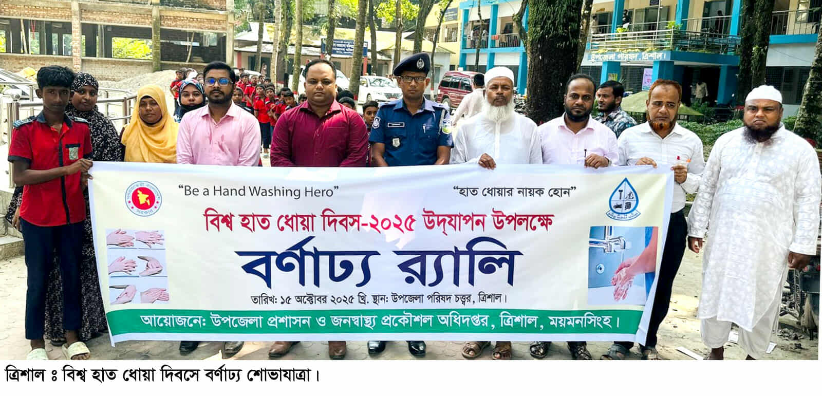‘হাত ধোয়ার নায়ক হোন’ প্রতিপাদ্যকে সামনে রেখে ময়মনসিংহের ত্রিশালে পালিত হয়েছে বিশ্ব হাত ধোয়া দিবস।এ উপলক্ষে উপজেলা প্রশাসন ও জনস্বাস্থ্য প্রকৌশল অধিদপ্তরের যৌথ আয়োজনে বুধবার (১৫ অক্টোবর) সকালে উপজেলা পরিষদের সামনে শোভাযাত্রা বের হয়। পরে হাত ধোয়া প্রদর্শনীতে পৌর শহরের বিভিন্ন শিক্ষা প্রতিষ্ঠানের শিক্ষার্থীদের হাত ধোয়ার পদ্ধতি শিখানো হয়।
