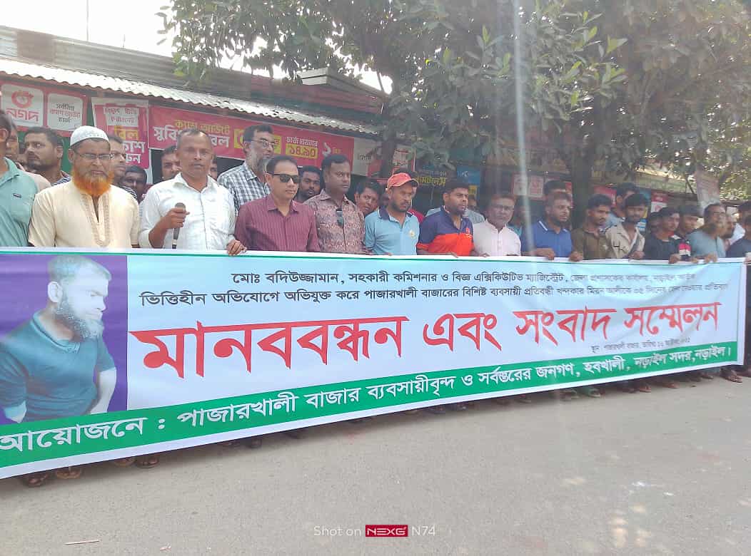 নড়াইল সদরের পাজারখালী বাজারের ব্যবসায়ী ও প্রতিবন্ধী খন্দকার মিরন আলীকে ৫ দিনের জেল প্রদানের প্রতিবাদে মানববন্ধন হয়েছে। বৃহস্পতিবার (১৬ অক্টোবর) সকালে পাজারখালী বাজারে এই কর্মসূচির আয়োজন করেন স্থানীয় ব্যবসায়ীবৃন্দ ও সর্বস্তরের জনগণ।