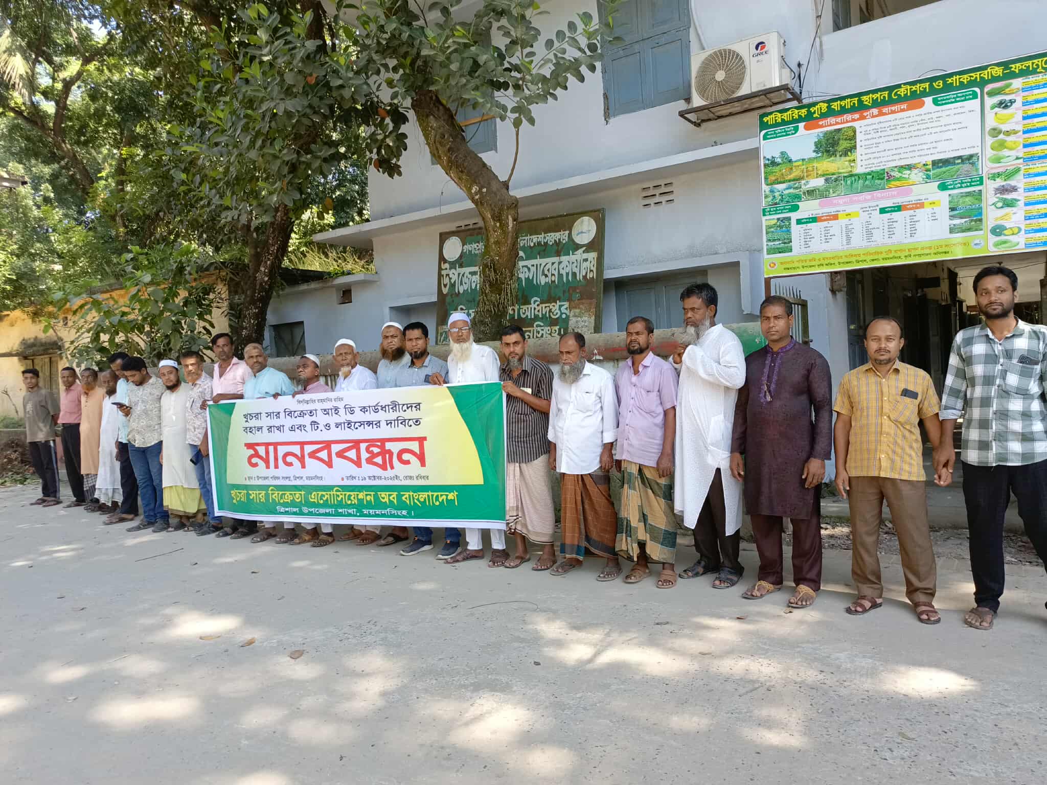 মানববন্ধনে খুচরা সার এসোসিয়েশন উপজেলা শাখার সাধারণ সম্পাদক কৃষিবিদ মোঃ নজরুল ইসলাম খান বলেন, সম্প্রতি অন্তর্বর্তীকালীন সরকারের কৃষি উপদেষ্টা সংবাদ সম্মেলনে জানিয়েছেন যে, দেশব্যাপী লাইসেন্সধারী খুচরা সার বিক্রেতাদের সনদ স্থগিত করা হবে এবং খুচরা সার বিক্রেতা হিসেবে কাউকে আর পৃষ্ঠপোষকতা দেওয়া হবে না। এ ঘোষণায় সারাদেশের প্রায় ৪৪ হাজার খুচরা সার বিক্রেতা মারাত্মকভাবে হতাশ ও উৎকণ্ঠিত হয়ে পড়েছেন। তারা দীর্ঘ ৩০ বছরের বেশি সময় ধরে পৈত্রিকসূত্রে সার ব্যবসায় নিয়োজিত, কৃষক পর্যায়ে সার পৌঁছে দিচ্ছেন, ব্যাংক ঋণ গ্রহণ করে কাজ করছেন। ফলে খুচরা বিক্রেতাদের জীবিকা বন্ধ হয়ে গেলে তাদের পরিবারসহ প্রায় ৫ কোটি কৃষক ক্ষতিগ্রস্ত হবেন।