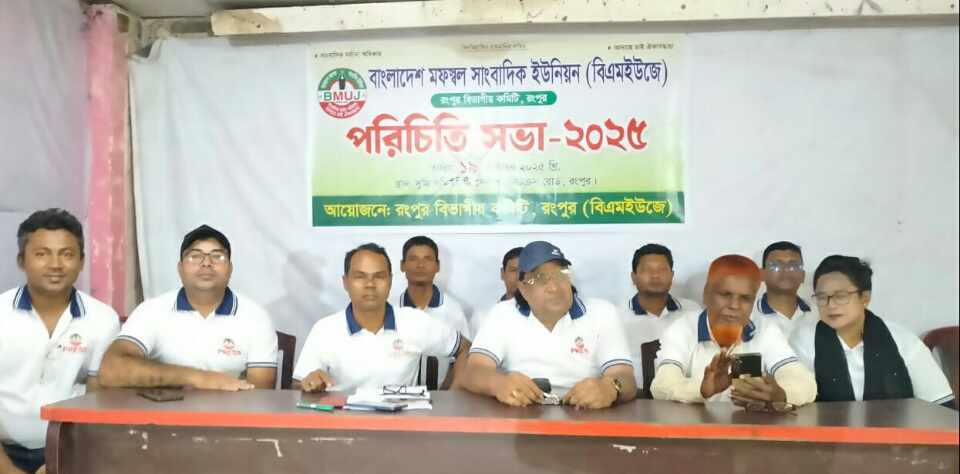 বাংলাদেশ মফস্বল সাংবাদিক ইউনিয়ন (বিএমইউজে) রংপুর বিভাগীয় পরিচিতি সভা অনুষ্ঠিত হয়েছে। রোববার ১৯ অক্টোবর সকাল ১১টায় রংপুর শহরের সুমি কমিউনিটি সেন্টারে অনুষ্ঠিত হয়। সভায় সভাপতিত্ব করেন দৈনিক বাংলা রংপুর প্রতিনিধি মীর আনোয়ার আলী মিঠু এবং সঞ্চালনা করেন দৈনিক ভোরের আকাশ রংপুর প্রতিনিধি বাবলুর রহমান বারী। পরিচিতি সভায় সংগঠনের লক্ষ্য ও উদ্দেশ্য তুলে ধরে নেতৃবৃন্দ দায়িত্বশীলতার সঙ্গে পেশাদার সাংবাদিকতা করার আহ্বান জানান। স্বাগত বক্তব্যে দৈনিক বিজনেস বাংলাদেশ রংপুর প্রতিনিধি ও বিএমইউজের রংপুর বিভাগীয় শাখার নারী বিয়য়ক সম্পাদক রেখা মনি সংগঠনের কার্যক্রম সম্প্রসারণ ও সাংবাদিকদের পারস্পরিক ঐক্য বৃদ্ধির ওপর গুরুত্ব আরোপ করেন।সভায় রংপুর বিভাগের বিভিন্ন জেলা থেকে বিএমইউজে নেতৃবৃন্দ ও সাংবাদিকরা উপস্থিত ছিলেন।