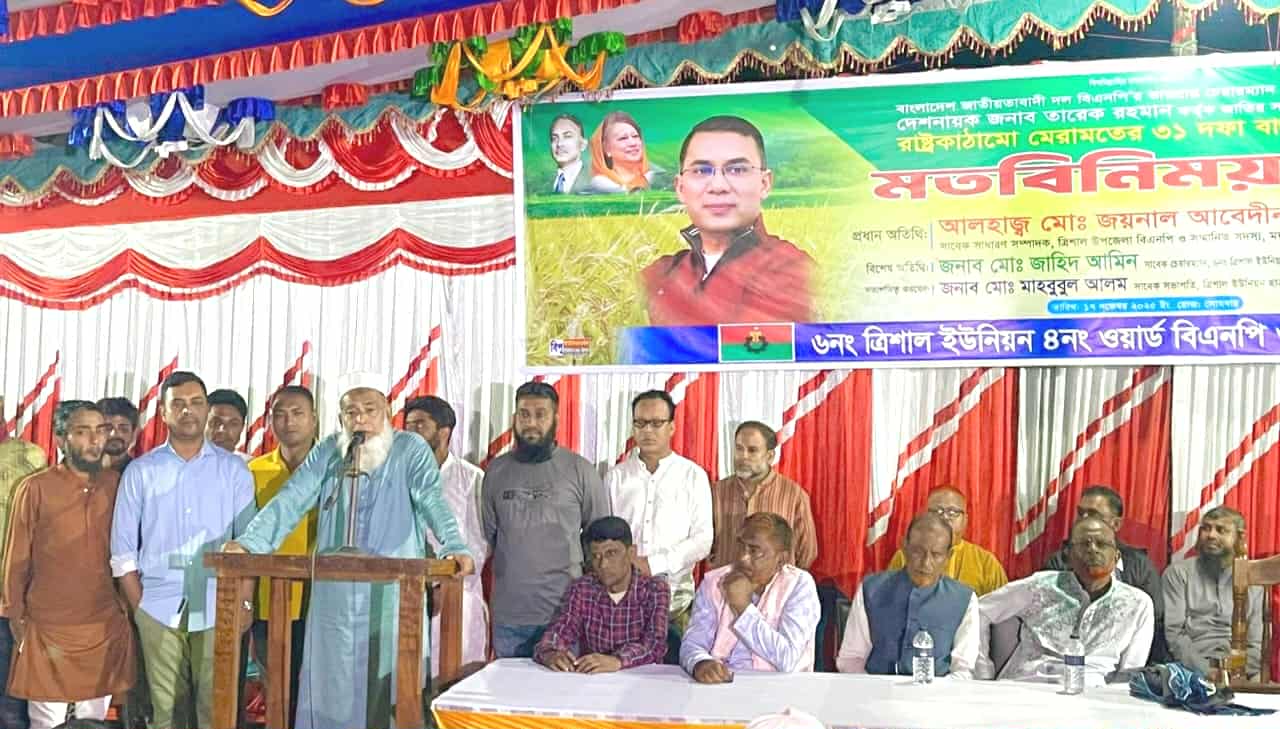 বিএনপি'র ভারপ্রাপ্ত চেয়ারম্যান তারেক রহমান কর্তৃক ঘোষিত রাষ্ট্রকাঠামো মেরামতের ৩১ দফা বাস্তবায়নের লক্ষ্যে ময়মনসিংহের ত্রিশালে মতবিনিময় সভা অনুষ্ঠিত হয়েছে। সোমবার (১৭ নভেম্বর) সন্ধ্যায় উপজেলার সদর ইউনিয়নে ৪নং ওয়ার্ড বিএনপি ও তার সকল অঙ্গ-সহযোগী সংগঠনের উদ্যোগে চকপাঁচপাড়া সরকারী প্রাথমিক বিদ্যালয় মাঠে এ মতবিনিময় সভা জনসভায় রূপান্তরিত হয়। শীত উপেক্ষা করে দলীয় নেতাকর্মী ছাড়াও ঢল নামে জনতার। মতবিনিময় সভায় প্রধান অতিথি হিসেবে উপস্থিত ছিলেন ময়মনসিংহ দক্ষিণ জেলা বিএনপি'র অন্যতম সদস্য, ত্রিশাল উপজেলা পরিষদের সাবেক চেয়ারম্যান আলহাজ্ব মোঃ জয়নাল আবদীন।