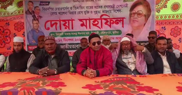 কুষ্টিয়ার দৌলতপুর উপজেলার চিলমারী ইউনিয়ন বিএনপির ও সকল অঙ্গ সংগঠনের আয়োজনে ও ঢাকা মহানগর উত্তর যুবদলের আহ্বায়ক শরীফ উদ্দিন জুয়েলের সৌজন্যে চিলমারী বাজারে বিএনপির চেয়ারপারসন বেগম খালেদা জিয়ার রোগ মুক্তি ও সুস্থতা কামনায় বিশেষ দোয়া মাহফিল অনুষ্ঠিত হয়েছে শুধু। শুক্রবার (১২ ডিসেম্বর ) বিকেল ৪ টার সময় আয়োজিত এ দোয়া মাহফিলে প্রধান অতিথি হিসেবে উপস্থিত উপজেলা বিএনপির সাবেক সদস্য আলাউদ্দিন বাদল । পবিত্র কোরআন তিলাওয়াতের মাধ্যমে অনুষ্ঠানের সূচনা হয়। শেষে দেশনেত্রী বেগম খালেদা জিয়ার সুস্থতা কামনা করে বিশেষ মোনাজাত ও দোয়া অনুষ্ঠিত হয়েছে। অনুষ্ঠানে আরও উপস্থিত ছিলেন দৌলতপুর উপজেলা বিএনপির প্রতিষ্ঠাকালীন সভাপতি আলতাফ হোসেন, সাবেক যুগ্ম সাধারণ সম্পাদক হারুনর রশীদ, সাবেক সদস্য আলাউদ্দিন বাদল, উপজেলা ছাত্রদল ও যুবদলের সাবেক সাধারণ সম্পাদক মনিরুজ্জামান মুনতাজ, দৌলতপুর উপজেলা যুবদলের সদস্য সচিব মাছুম প্রফেসর, যুগ্ম আহ্বায়ক জাফর ইকবাল কর্নেল, রাছেল আলী, রাজিব কিবরিয়া, যুবনেতা সুমন ফরাজি, সুমন আলী, কবির হোসেন, মারুফ হোসেন, কুদ্দুস আলী, টুটুল হোসেন , রাজশাহী বিশ্ববিদ্যালয় ছাত্রদলের সহ সভাপতি বুলবুল রহমান, কুষ্টিয়া জেলা ছাত্রদলের যুগ্ম আহ্বায়ক বজলুর রহমান, দৌলতপুর উপজেলা ছাত্রদলের সদস্য সচিব সুমন গাজী, যুগ্ম আহ্বায়ক রিপন আলী, দৌলতপুর কলেজ ছাত্রদলের সাধারণ সম্পাদক আকাশ আলী, উপজেলা কৃষকদলের আহ্বায়ক আরিফুল ইসলাম নান্নু, যুগ্ম আহ্বায়ক বুলবুল হোসেন, তমেজ আলী, তাঁতী দলের সাধারণ সম্পাদক রিপন মাস্টার, সহ সভাপতি আফিরুল বিশ্বাস, সমবায় দলের সদস্য সচিব তারাচাদ আলী,সহ আর উপস্থিত ছিলেন চিলমারী ইউনিয়নে হাজার হাজার বিএনপির ও সহ অঙ্গ-সহযোগী সংগঠনের নেতাকর্মীরা।