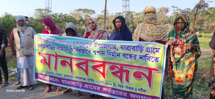 গোপালগঞ্জের মুকসুদপুর উপজেলার গোহালা ইউনিয়নের যাত্রাবাড়ী গ্রামে সরকারি খাস জমি ও কুমার নদী দখল করে অবৈধভাবে শ্মশান নির্মাণের প্রতিবাদে মানববন্ধন কর্মসূচি পালন করেছে গ্রামবাসী।