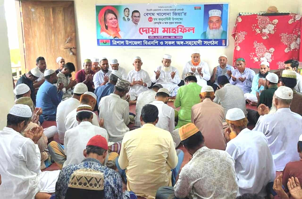 বিএনপি'র চেয়ারপার্সন ও সাবেক প্রধানমন্ত্রী দেশনেত্রী বেগম খালেদা জিয়ার ৮০তম জন্মবার্ষিকী উপলক্ষ্যে রোগ মুক্তি ও আশু সুস্থতা কামনায় ময়মনসিংহের ত্রিশালে কুরআনখানী মিলাদ ও দোয়া মাহফিল অনুষ্ঠিত হয়েছে।