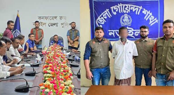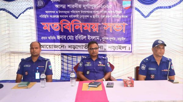 খন্দকার ছদরুজ্জামান,নড়াইল: নড়াইলের কালিয়া ও নড়াগাতী থানায় আসন্ন শারদীয় দুর্গোৎসব উপলক্ষ্যে আইন-শৃঙ্খলা বিষয়ক মতবিনিময় সভা অনুষ্ঠিত। আসন্ন শারদীয় দুর্গোৎসব নির্বিঘ্নে ও শান্তিপূর্ণভাবে উদযাপন। শনিবার (২০ সেপ্টেম্বর) কালিয়া থানা নড়াগাতী থানায়