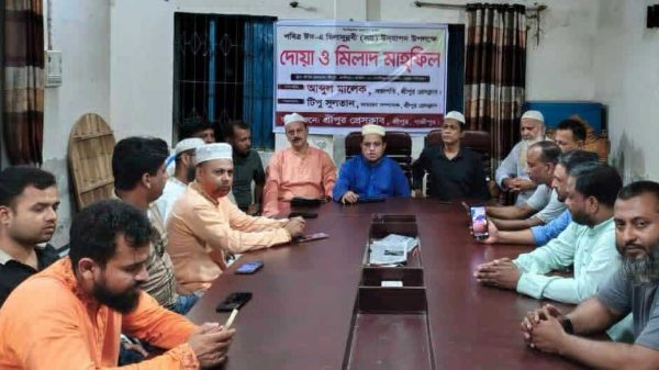 এস এম দূর্জয়, গাজীপুর: গাজীপুরের শ্রীপুর প্রেসক্লাবের আয়োজনে যথাযথ মর্যাদায় পবিত্র ঈদে মিলাদুন্নবী(সাঃ)উদযাপন উপলক্ষে মিলাদ ও দোয়া মাহফিল অনুষ্ঠিত হয়েছে।শনিবার(৬ সেপ্টেম্বর) সন্ধ্যায় শ্রীপুর প্রেসক্লাব কার্যালয়ে এই অনুষ্ঠান অনুষ্ঠিত হয়।শ্রীপুর প্রেসক্লাবের