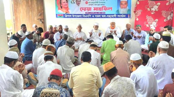 এস এম মাসুদ রানা, ত্রিশাল (ময়মনসিংহ): বিএনপি’র চেয়ারপার্সন ও সাবেক প্রধানমন্ত্রী দেশনেত্রী বেগম খালেদা জিয়ার ৮০তম জন্মবার্ষিকী উপলক্ষ্যে রোগ মুক্তি ও আশু সুস্থতা কামনায় ময়মনসিংহের ত্রিশালে কুরআনখানী মিলাদ ও দোয়া