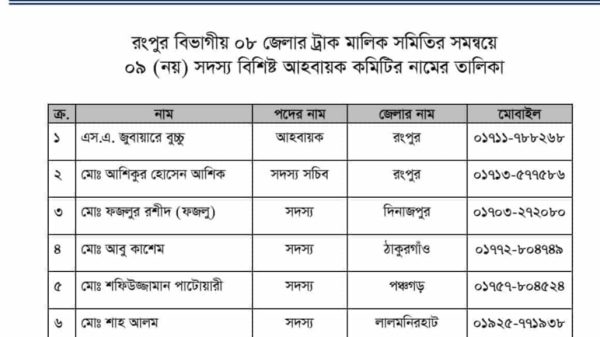 শরিফা বেগম শিউলী,স্টাফ রিপোর্টার: রংপুর বিভাগীয় ট্রাক কাভার্ডভ্যান মালিক সমিতির সমন্বয়ে ০৯ (নয়) সদস্য বিশিষ্ট আহবায়ক কমিটির নামের তালিকা প্রকাশ করেছে সংগঠনটি। রোববার (১০ আগস্ট) দুপুরের দিকে রংপুর বিভাগীয় ট্রাক