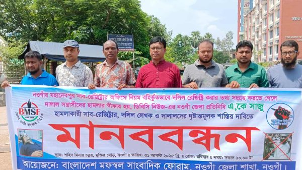 নাজমুল হক, নওগাঁ: নওগাঁর মহাদেবপুর সাব-রেজিস্ট্রি অফিসে তথ্য সংগ্রহ করতে গিয়ে ডিবিসি নিউজের নওগাঁ জেলা প্রতিনিধি সাংবাদিক এ. কে. সাজুর ওপর সন্ত্রাসী হামলার প্রতিবাদে নওগাঁয় মানববন্ধন ও বিক্ষোভ সমাবেশ অনুষ্ঠিত