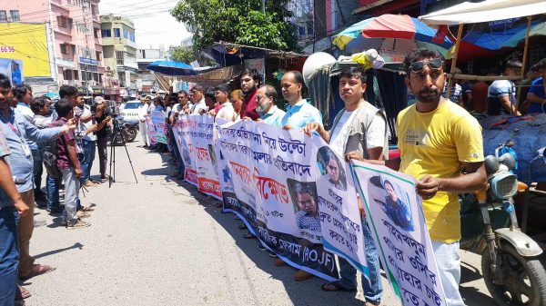 শফিকুল আলম ইমন, রাজশাহী: রাজশাহীতে স্থানীয় পত্রিকার একজন সম্পাদকসহ ছয় সাংবাদিকের বিরুদ্ধে দায়েরকৃত মামলার প্রতিবাদে মানববন্ধন ও বিক্ষোভ শেষে নতুন কর্মসূচি ঘোষণা করেছে বিভিন্ন সাংবাদিক সংগঠন। শনিবার (৬ সেপ্টেম্বর) বেলা